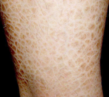 3,皮肤损害象“鱼鳞”或“蛇皮”样,呈多角形或菱形,中间附着,边缘上翘,小腿前面较常见,四肢的伸侧比屈侧严重,腋窝、肘窝、腘窝、腹股沟这些相对潮湿的地方往往没有什么异常。脱落的皮屑般是白色。患者皮肤干燥,严重的时候会瘙痒。