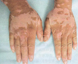 3、发病部位症状:患者不同部位的脱色程度不同,色调也有些区别,般呈淡白色、乳白色、云白色、瓷白色等。而且白癜风较初的症状表现并不明显,般表现为白斑,且白斑通常发无定处,数目也不确定。